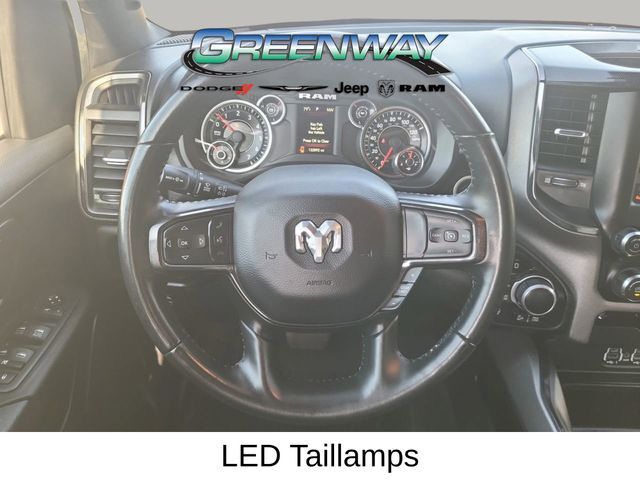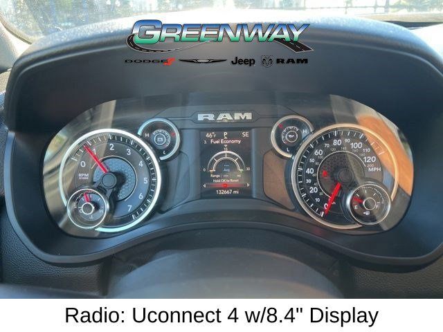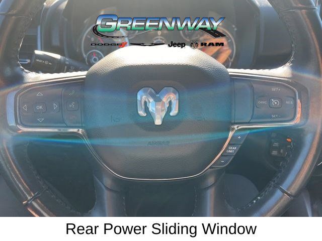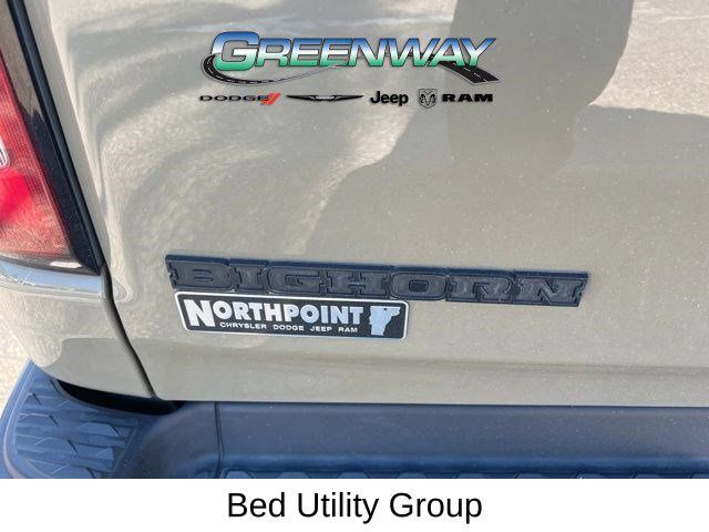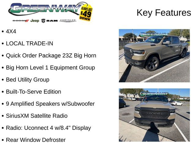 4X4, LOCAL TRADE-IN, 20" x 9" Aluminum Wheels, 2nd Row In Floor Storage Bins, 4 Adjustable Cargo Tie-Down Hooks, 9 Amplified Speakers w/Subwoofer, Auto-Dimming Rear-View Mirror, Bed Utility Group, Big Horn Badge, Big Horn IP Badge, Big Horn Level 1 Equipment Group, Black Door Handles, Black Exterior Truck Badging, Black Front Bumper, Black Headlamp Bezels, Black Onyx Interior Accent, Black Premium Power Mirrors, Black Rear Bumper, Black Tubular Side Steps, Body Color Fender Flares, Bucket Seats, Built-To-Serve Edition, Built-To-Serve Edition I/P Badge, Center Console Parts Module, Class IV Receiver Hitch, Cluster 3.5" TFT Color Display, Deployable Bed Step, Dual Exhaust w/Black Tips, E-Locker Rear Axle, Foam Bottle Insert (Door Trim Panel), Front & Rear Rubber Floor Mats, Front Extra HD Shock Absorbers, Front LED Fog Lamps, Full Length Floor Console, Glove Box Lamp, Grille Surround 1 Black Texture 1 Black, Hill Descent Control, LED Reflector Headlamps, LED Taillamps, Pick-Up Box Lighting, Power 4-Way Driver Lumbar Adjust, Power 8-Way Driver Seat, Power Adjustable Pedals, Premium Cloth/Vinyl Bucket Seats, Quick Order Package 23Z Big Horn, Radio: Uconnect 4 w/8.4" Display, RAM Grille Badge - Black, Rear Dome w/On/Off Switch Lamp, Rear Extra HD Shock Absorbers, Rear Power Sliding Window, Rear Window Defroster, Remote keyless entry, SiriusXM Satellite Radio, Spray In Bedliner, Steering wheel mounted audio controls, Sun Visors w/Illuminated Vanity Mirrors, Tow Hooks, Universal Garage Door Opener, US Flag Decal. CARFAX One-Owner.