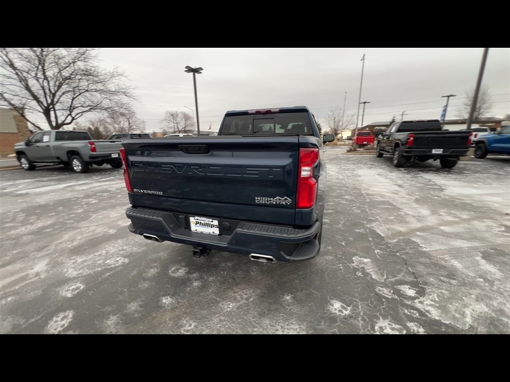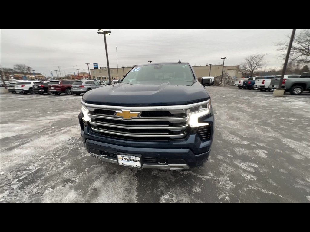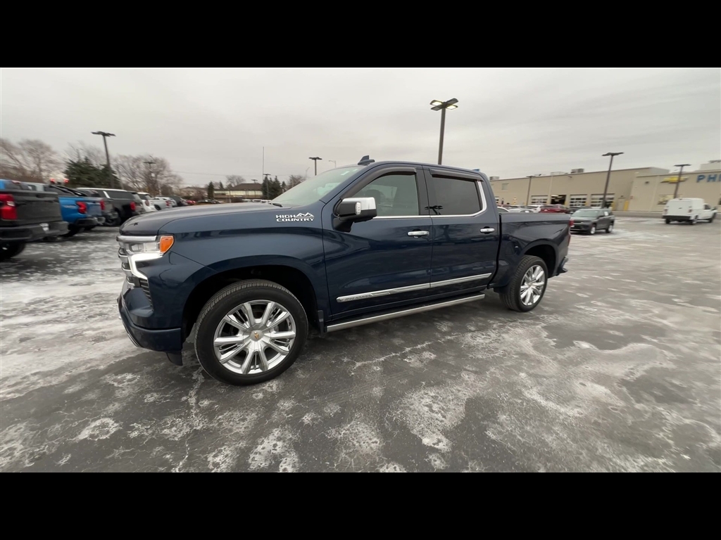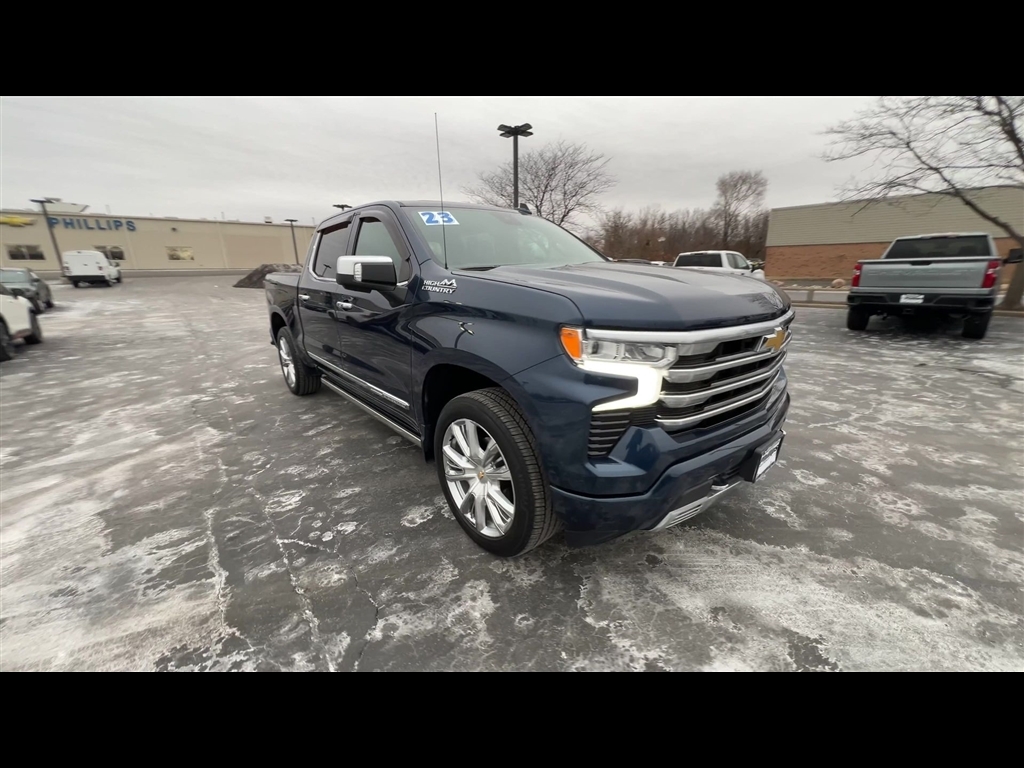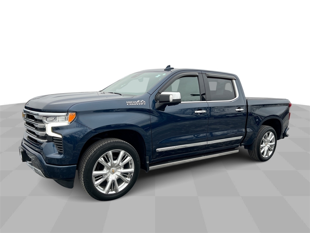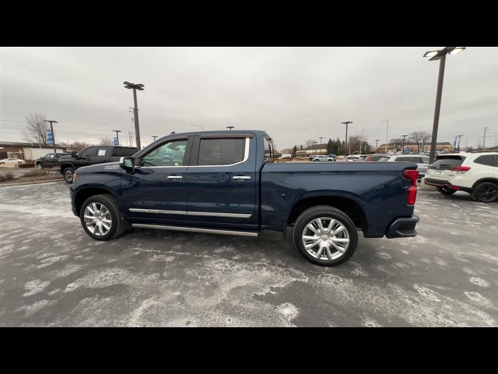 CarBravo Certified, 4WD, Leather Seats, Bucket Seats w/ Center Console, Premium Package, 22 Wheels, Sunroof, Trailering Package, Backup Camera, Remote Start, Pwr Dr Seat, Forward Collision Alert, Head-Up Display, Navigation, Bose Audio, Side Blind Zone Alert, Rear Cross Traffic Alert, Lane Departure Warning, Lane Change Alert, Lane Keep Assist, Front & Rear Park Assist, Adaptive Cruise Control, Heated Seats, Heated Steering Wheel, Ventilated Seats, Memory Seating, Apple CarPlay, Carfax Buyback Guarantee, Silverado 1500 High Country, 4D Crew Cab, EcoTec3 5.3L V8, 10-Speed Automatic, 4WD, Northsky Blue Metallic, Jet Black/Nightshift Blue w/Perforated Leather Seat Trim, 10-Way Power Driver Seat w/Lumbar, 10-Way Power Passenger Seat Adjuster w/Lumbar, 12.3 Multicolor Reconfigurable Digital Display, 120-Volt Instrument Panel Power Outlet, 15 Diagonal Multicolor Head-Up Display, 170 Amp Alternator, 2 USB Data Ports, 2nd Row Heated Outboard Seats, 3.23 Rear Axle Ratio, 4-Wheel Disc Brakes, ABS brakes, Adaptive Cruise Control, Adaptive Ride Control Suspension, Air Conditioning, AM/FM radio: SiriusXM with 360L, Apple CarPlay/Android Auto, Auto High-beam Headlights, Auto-dimming door mirrors, Auto-Dimming Inside Rear-View Mirror, Auto-Locking Rear Differential, Automatic Emergency Braking, Automatic temperature control, Bed View Camera, Bluetooth For Phone, Body-Color Painted Mirror Caps, Bodyside moldings, Brake assist, Bumpers: body-color, Chevrolet Connected Access Capable, Chevytec Spray-On Black Bedliner, Chrome Assist Steps, Chrome Recovery Hooks, Color-Keyed Carpeting Floor Covering, Compass, Deep-Tinted Glass, Driver door bin, Driver Memory, Driver vanity mirror, Dual Exhaust w/Polished Outlets, Dual front impact airbags, Dual front side impact airbags, Dual Rear USB Ports (Charge Only), Electric Rear-Window Defogger, Electrical Steering Column Lock, Electronic Stability Control, Electronic Transmission Range Selector Shifter, Floor Mounted Center Console, Following Distance Indicator, Forward Collision Alert, Front anti-roll bar, Front Bucket Seats, Front Carpeted Floor Mats, Front Center Armrest, Front dual zone A/C, Front fog lights, Front LED Fog Lamps, Front Pedestrian Braking, Front Rainsensing Wipers, Front reading lights, Front wheel independent suspension, Fully automatic headlights, Garage door transmitter, Genuine wood console insert, Genuine wood dashboard insert, Genuine wood door panel insert, HD Surround Vision, Heated door mirrors, H