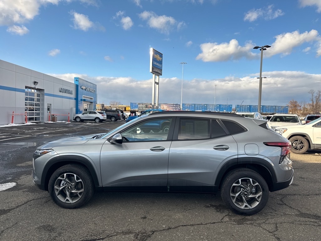 2025 Chevrolet Trax 1LT for sale at Central Chevrolet in West Springfield, MA. This exceptional used Trax 1LT is presented in Sterling Gray Metallic with a Jet Black interior featuring Blue Accents and boasts an incredibly low 7197 miles, making it a low mileage gem. It is powered by a fuel-efficient ECOTEC 1.2L Turbo engine paired with a smooth 6-speed automatic transmission. Drive with confidence knowing this Trax has undergone a thorough reconditioning process, including a clean Carfax report, a single previous owner, a fresh oil change, HVAC service, a full detail, a pre-delivery safety inspection, and the convenience of remote start. This Trax 1LT comes equipped with a standard advanced color LCD display with wireless Apple CarPlay and Android Auto integration, allowing seamless smartphone connectivity. Experience enhanced safety with Chevy Safety Assist, featuring Forward Collision Alert, Automatic Emergency Braking, Front Pedestrian Braking, Lane Keep Assist with Lane Departure Warning, Following Distance Indicator, and IntelliBeam headlights. The vehicle also includes HD Rear Vision Camera and a Tire Pressure Monitoring System for added peace of mind. Comfort and convenience are paramount, with features like automatic climate control, a driver's 6-way manual seat, a 60/40 split rear seat, and a rear cargo privacy cover. The exterior is styled with 17-inch grey-painted machined aluminum wheels, body-color door handles and mirror caps, and LED daytime running lamps. Notable packages elevate this Trax even further. The Driver Confidence Package adds rear cross-traffic alert, lane change alert with side blind zone alert, adaptive cruise control, and rear park assist.