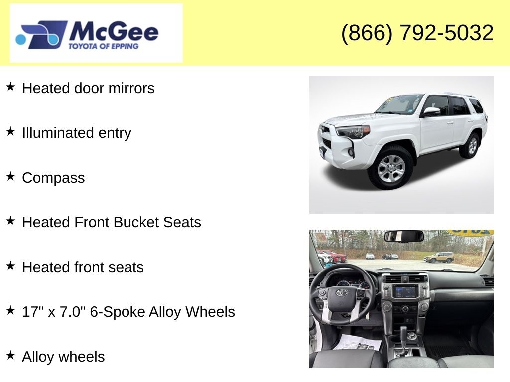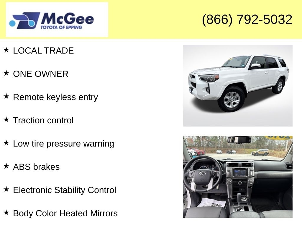 RELIABLE, SAFE FOR THE FAMILY AND A GREAT DAILY DRIVER, NON SMOKER VEHICLE, MUST SEE, TRANSPARENT PRICING AND A HASSLE-FREE EXPERIENCE!, FUEL EFFICIENT (MORE CASH IN YOUR POCKET), PRICED TO SELL, CLEAN CARFAX, EXCELLENT COLOR COMBINATION, LOCAL TRADE, ONE OWNER, WAS SPENT PREPARING THIS VEHICLE FOR SALE INCLUDING, BRAND NEW CABIN AIR FILTER, BRAND NEW ENGINE AIR FILTER, FRESH ENGINE OIL & FILTER, INSTALLED BOTH FRONT WIPER BLADES, INSTALLED REAR WIPER BLADE, PERFORMED 4-WHEEL COMPUTERIZED ALIGNMENT, ROTATED & BALANCED ALL TIRES, REAR DIFFERENTIAL FLUID SERVICE COMPLETED, BRAND NEW 12-VOLT VEHICLE BATTERY FOR GUARANTEED STARTING IN COLD WEATHER!, BRAND NEW SPARK PLUGS INSTALLED, PERFORMED COOLANT FLUSH SERVICE, FRONT DIFFERENTIAL FLUID SERVICE COMPLETED, PERFORMED TRANSMISSION FLUSH, $2,294.15 WAS APPROVED FOR MECHANICAL SERVICES, ALONG WITH ANY WEAR & TEAR ITEMS NEEDING REPLACEMENT. LESS MONEY OUT OF YOUR POCKET!, 2018 Toyota 4Runner SR5 Premium Rugged Body-On-Frame Capability, Premium Comfort, and Toyotas Unmatched Durability The 2018 Toyota 4Runner SR5 Premium is built for drivers who want true SUV toughness with everyday comfort and reliability. Powered by a proven 4.0L V6 engine producing 270 horsepower, the 4Runner delivers strong towing capability, confident off-road performance, and long-lasting durability that has made it a legend in the SUV world. With available 4WD with Active Traction Control, this 4Runner is ready for New England winters, trails, and weekend adventures. Inside, the SR5 Premium trim upgrades the experience with SofTex leather-trimmed seating, heated front seats, power drivers seat, Entune Premium Audio with Navigation, Bluetooth, a backup camera, and a versatile interior with folding rear seats for ample cargo space. The cabin is designed for comfort on longer trips while still offering the rugged practicality 4Runner owners expect. Signature 4Runner featuresincluding a power sliding rear window, skid plates, roof rails, and a high ground clearanceenhance both everyday convenience and off-road readiness. Safety includes stability control, anti-lock brakes, advanced airbags, and Toyotas reputation for exceptional build quality and longevity. With its rugged body-on-frame construction, reliable V6 power, and premium interior upgrades, the 2018 Toyota 4Runner SR5 Premium remains one of the most desirable traditional SUVs on the market., 4WD, Black Graphite w/Leather Seat Trim, 17x 7.06-Spoke Alloy Wheels, ABS brakes, Alloy whee